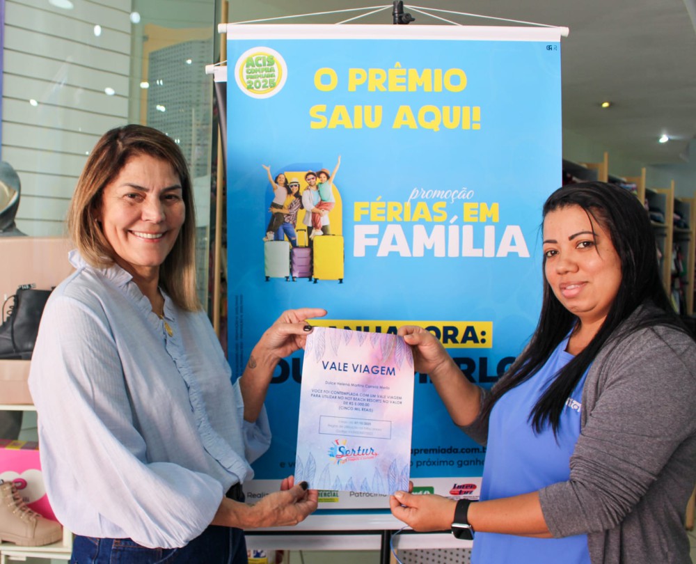 Na manhã desta quinta-feira, 07, a Associação Comercial e Industrial de Sertãozinho (ACIS) oficializou a entrega do prêmio principal da promoção “Férias em Família”, na loja Pick Tita, onde a consumidora Dulce Merlo realizou suas compras e recebeu o cupom sorteado, que lhe rendeu um vale-hospedagem para quatro pessoas (dois adultos e duas crianças) no Hot Beach Resort, em Olímpia/SP.