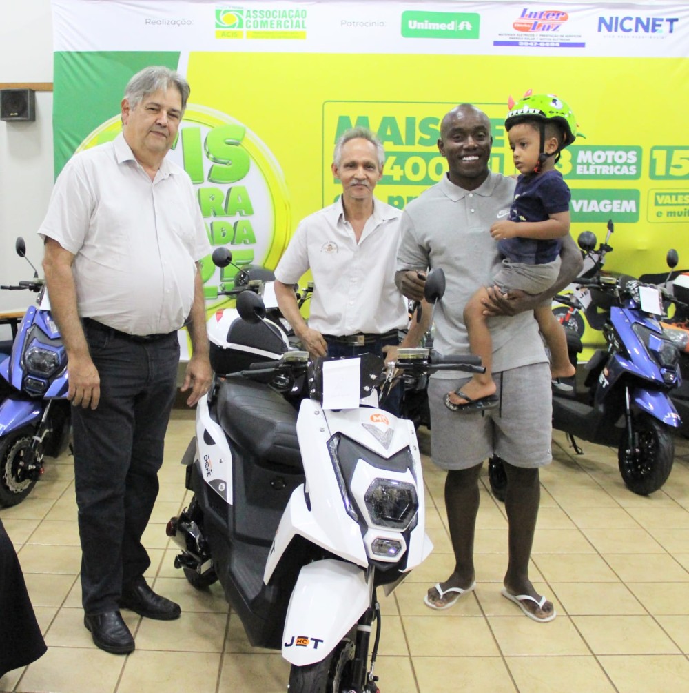 Os ganhadores da promoção “Natal Iluminado” receberam suas motos elétricas ao lado do presidente da ACIS, Walceles Paulo de Mello
