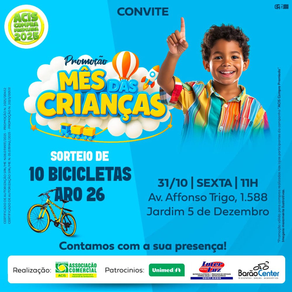 Nesta sexta-feira, dia 31, às 11h, na sede da Associação Comercial e Industrial de Sertãozinho, será realizado o sorteio de 10 bicicletas aro 26 pela promoção “Mês das Crianças”, que integra a campanha “ACIS Compra Premiada 2025”.